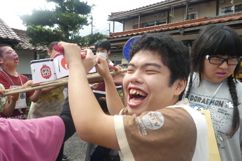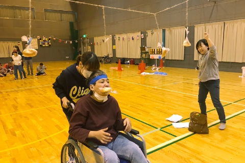 東広島運動公園の体育館にて運動会を行います。玉入れ、パン食い競争、タスキリレーを行い、力の限り競技に参加し、白熱した接戦で盛り上がります。