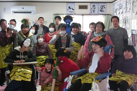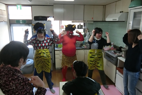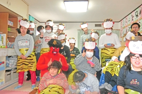 カップケーキをチョコやクリームでデコレーションして鬼の顔のケーキを作ったり、職員変装した鬼に向かって「鬼は外‼」「福は内‼」と元気よく豆を投げて今年1年の健康と福を祈願します。